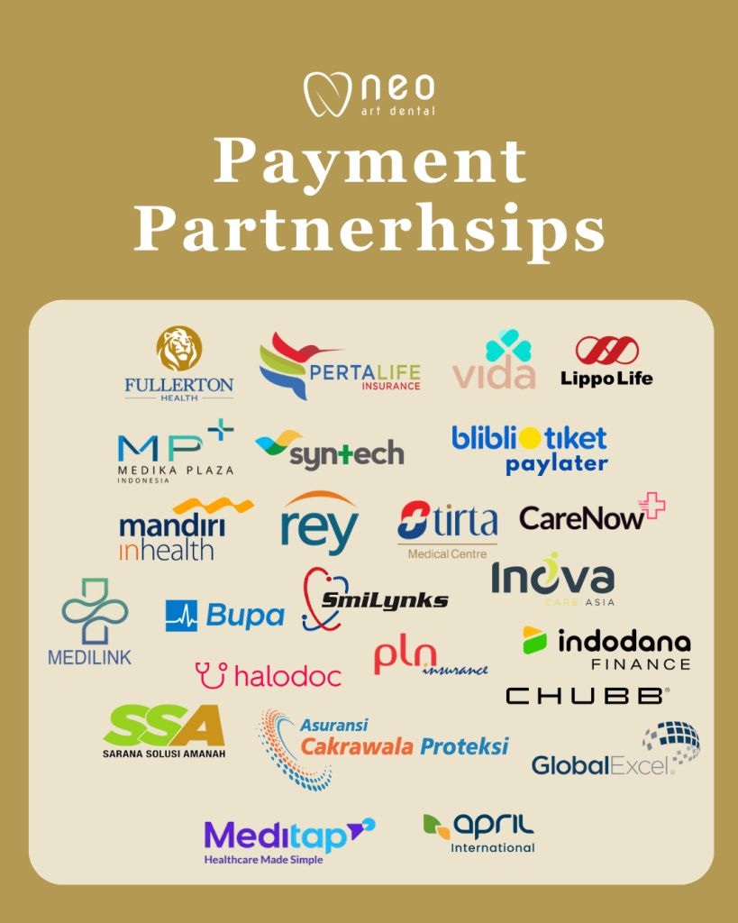Sedang mencari klinik gigi di BSD yang menerima asuransi? Neo Art Dental Center adalah pilihan tepat untuk Anda! Kami memahami bahwa kenyamanan dan kemudahan dalam proses pembayaran merupakan bagian penting dari pengalaman berobat yang menyenangkan. Oleh karena itu, kami bekerja sama dengan berbagai penyedia asuransi perawatan gigi, baik nasional maupun internasional, untuk memberikan layanan terbaik kepada Anda dan keluarga.